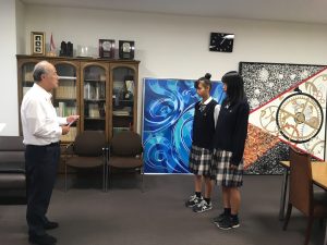 9月25日(火)、本校校長室において「第3回ユースオリンピック競技大会」に出場するU-18フットサル日本代表GK須藤 優理亜(3年)選手、FP追野 沙羅(3年)選手の激励会が行われました。