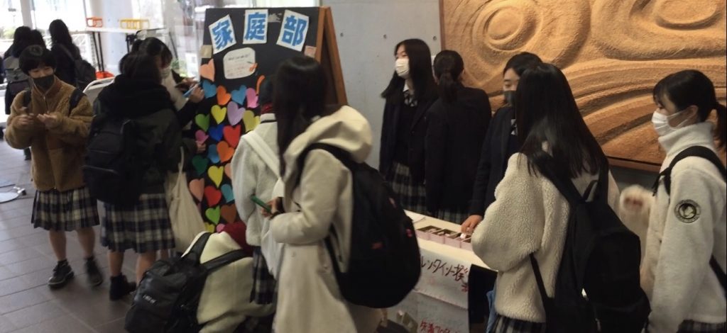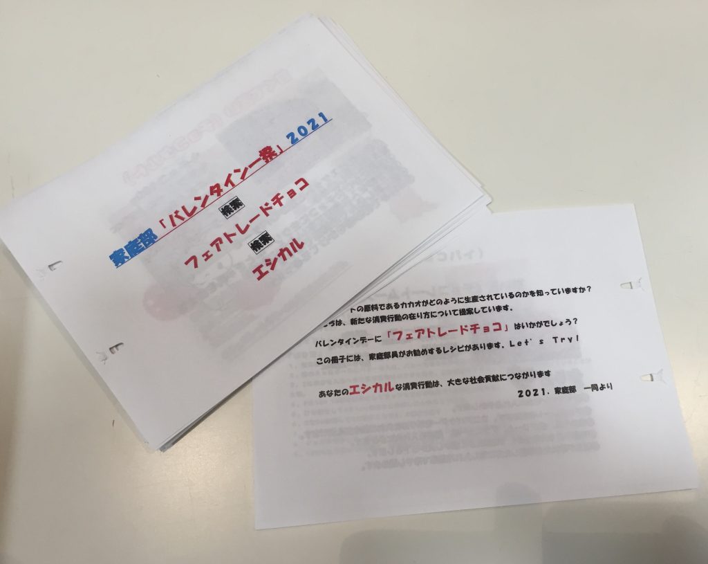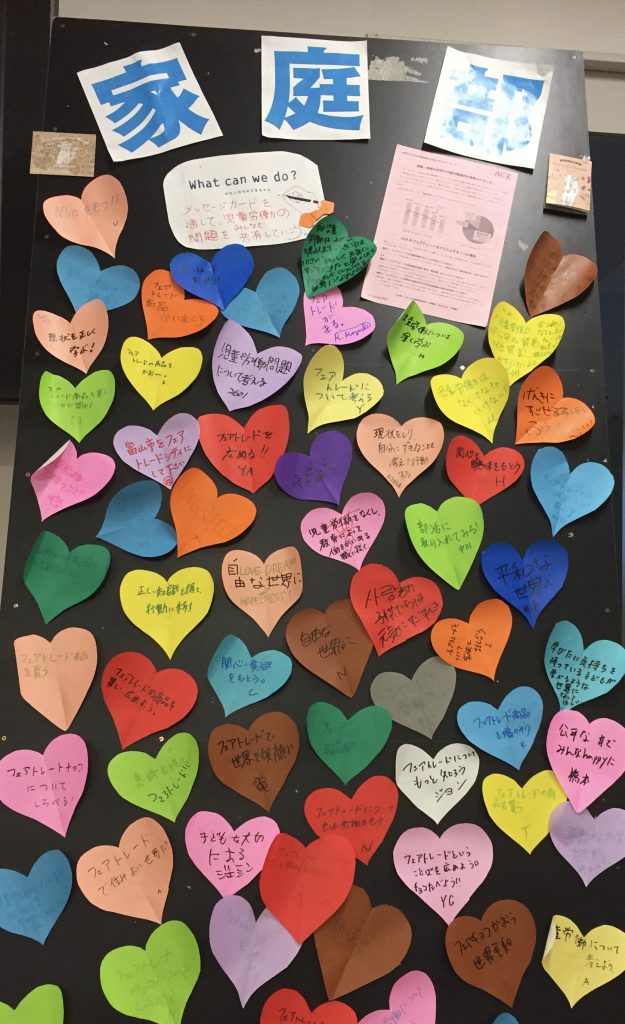 この活動に関心をもつ国際生(約70名)が、メッセージを書いてくれました。これらのメッセージは、エントランスにて紹介されました。また、家庭部員が“フェアートレードチョコ・レシピ(冊子)”を発行。国際生に“エシカル”な消費生活を提案しました。